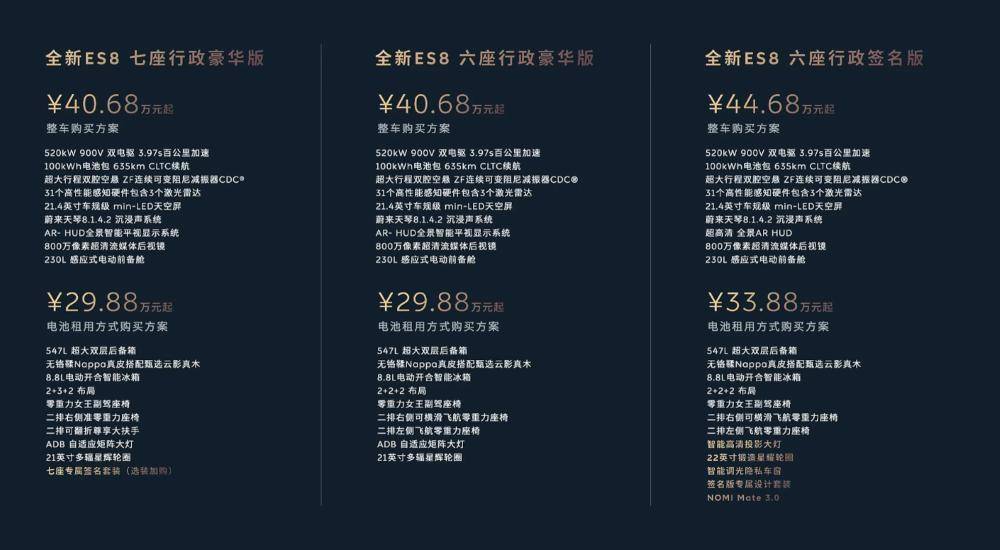 6座行政签名版整车购买价格为44.68万元起,采用电池租用服务(BaaS)后为33.88万元起;7座行政豪华版整车购买价格为40.68万元起,采用电池租用服务(BaaS)后为29.88万元起。